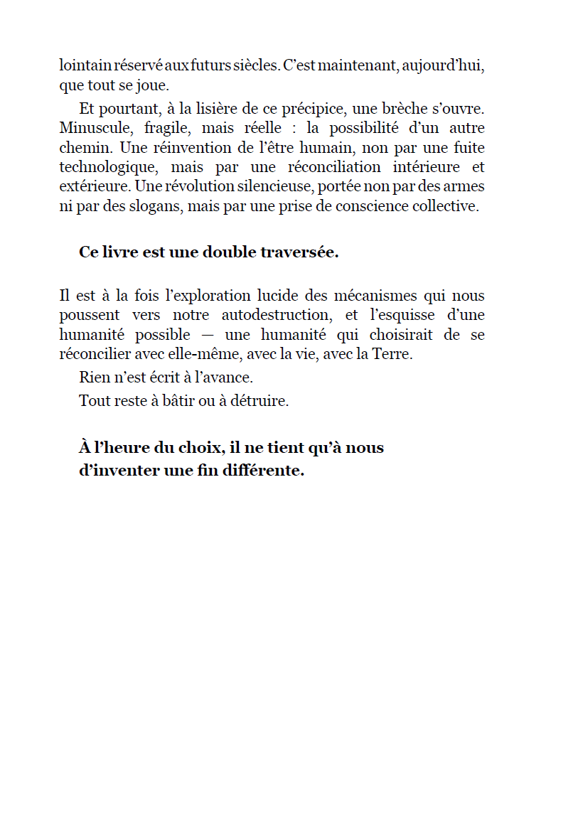 Écrit comme une introspection collective, ce texte invite chacun à regarder en face ce qui dysfonctionne — en soi, autour de soi, et à grande échelle.